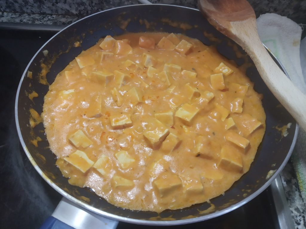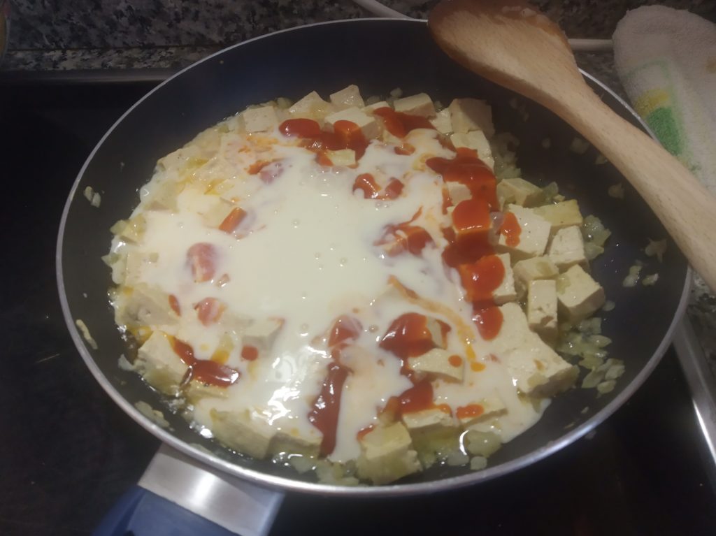 Bajar al mínimo el calor, en mi caso del 6 al 1, y echar el tomate frito y la crema de soja, mezclar y dejar a que espese un poco.