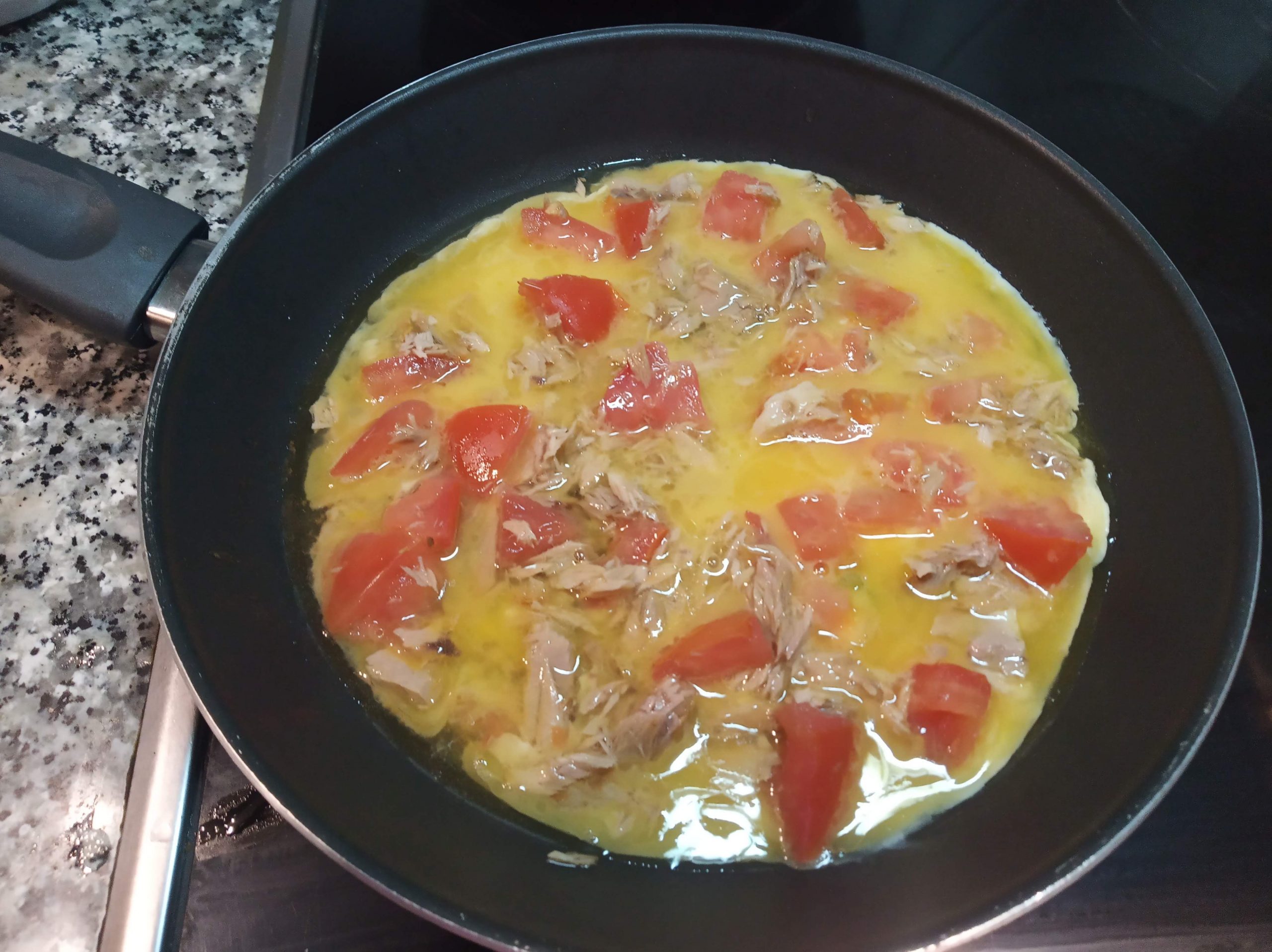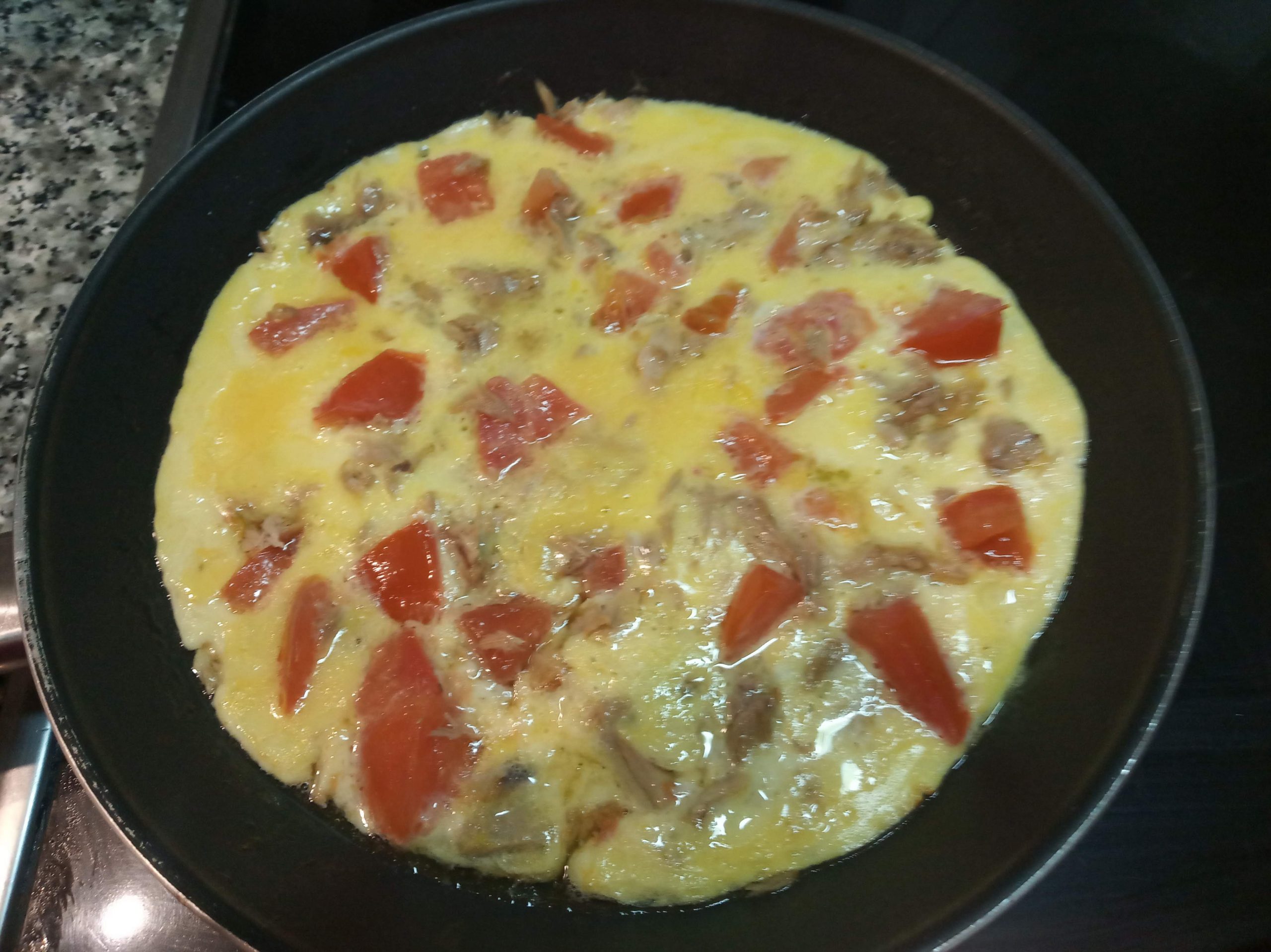 En este caso se a aprovechado el resto de un aliño, pero se puede hacer para dos personas, igualmente, con un tomate, lata de melva, su propio aceite y 4 huevos batidos.