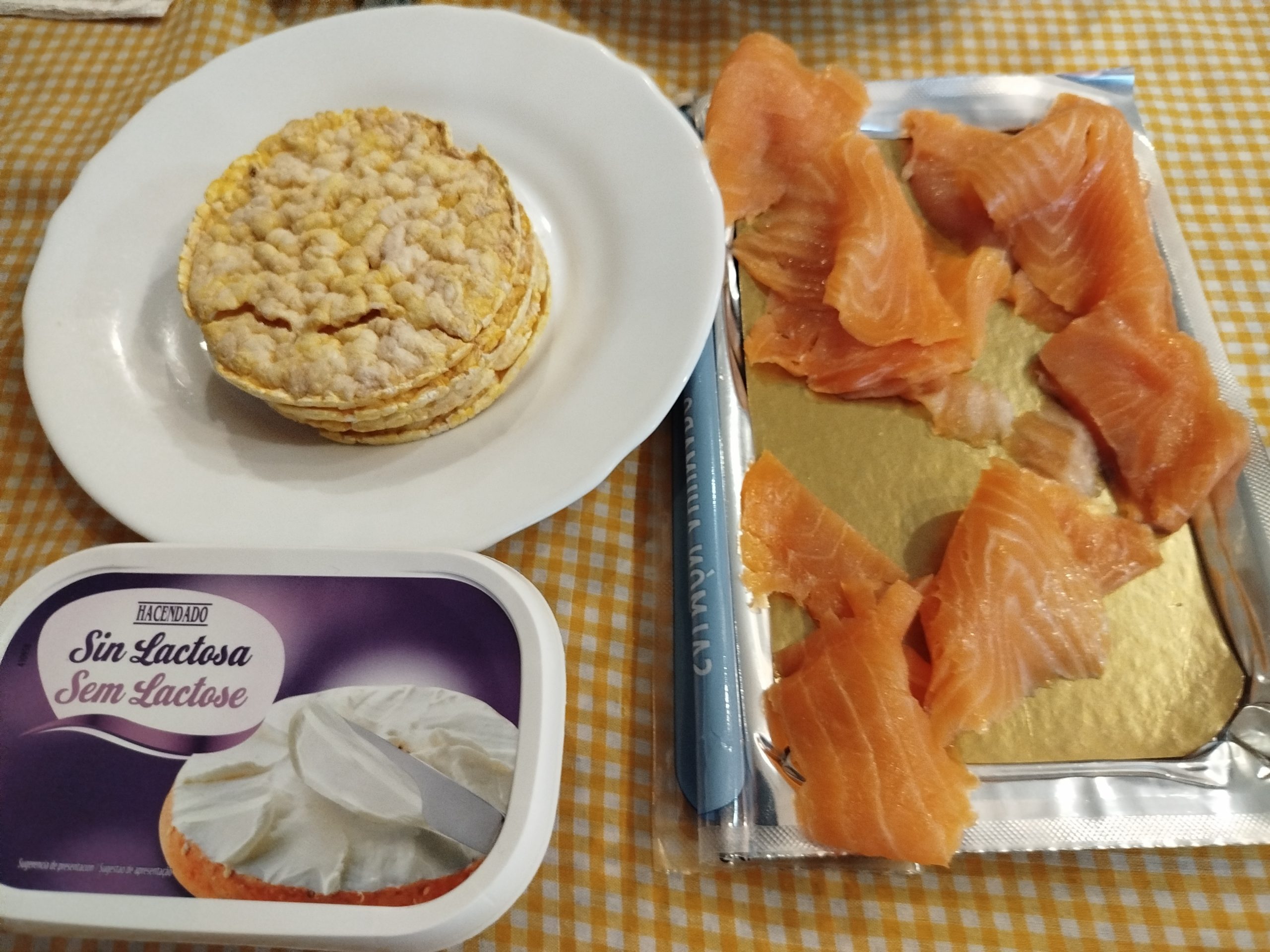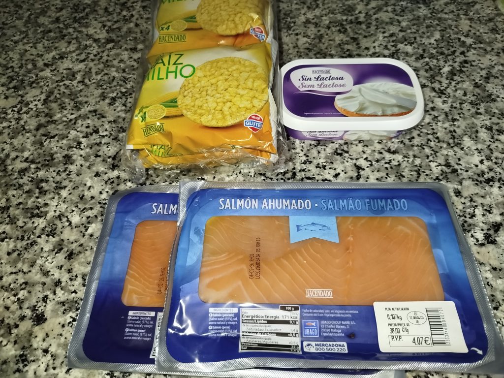 Presentar las tortitas en un plato, la tarrina de queso de untar y el salmón ahumado, abierto el paquete.