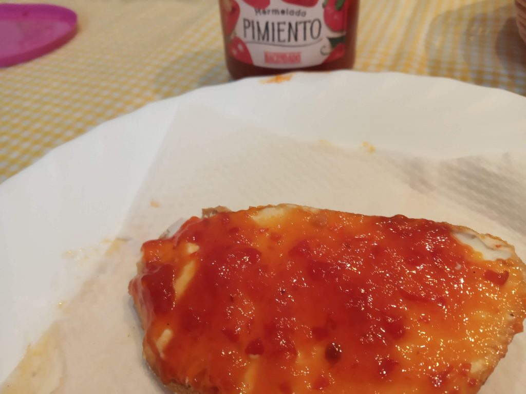 Extender con un cuchillo el queso y encima la mermelada de pimientos.