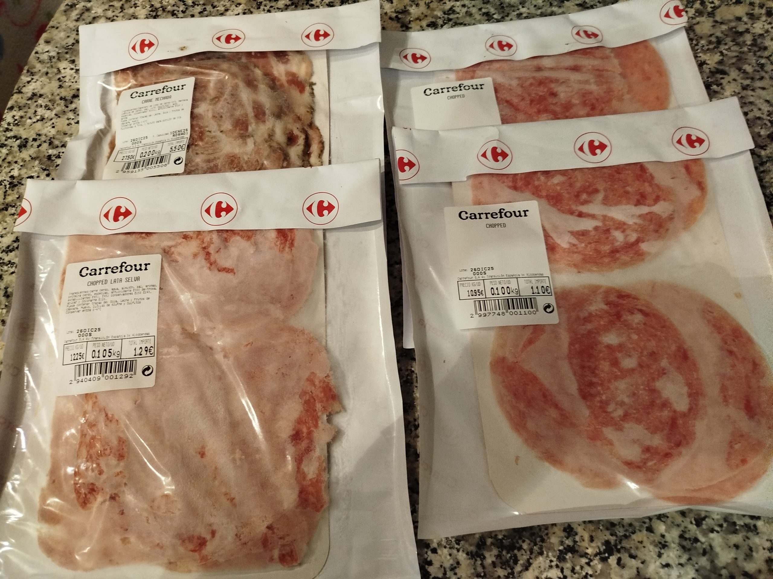 Suelo comprar últimamente, 100 g al corte de varios productos para desayunar o momento especial, de chóped, chorizo y salchichón de pavo, o normal, caña de lomo la más normalita para desayunar, etc., suelo congelarlo y divido para mi en dos tandas.