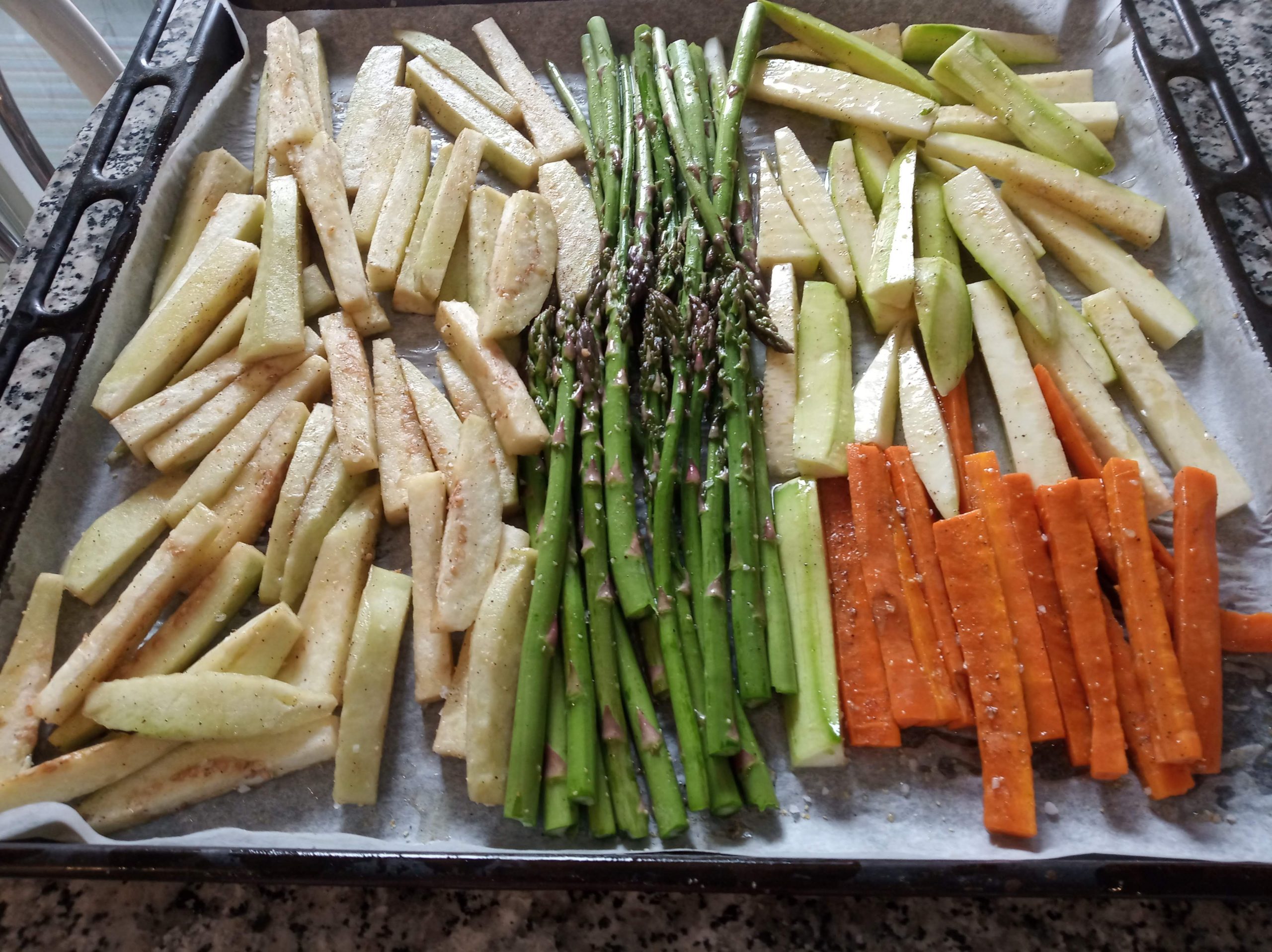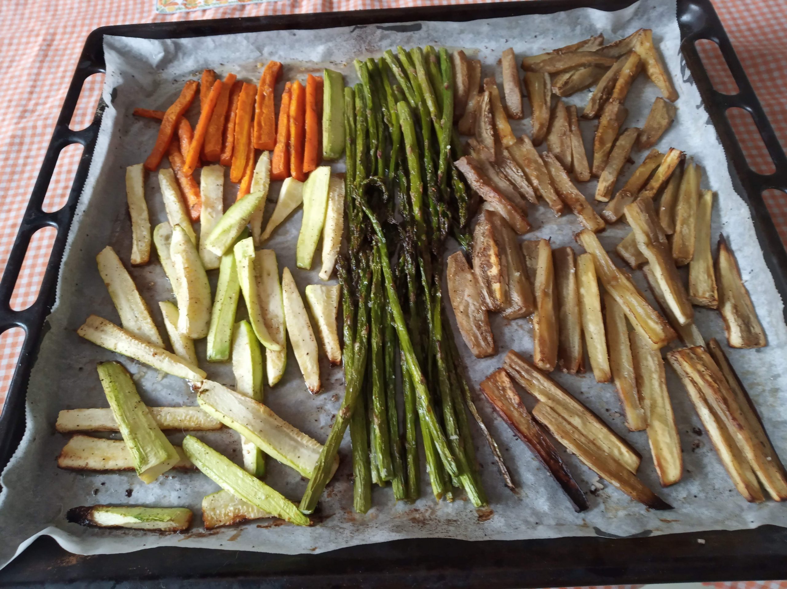 Moje la bandeja del horno las esquinas con un poco de agua, y puse un papel de horno encima, de esa forma no se mueve. Fui colocando las verduras, según las preparabas para el horno.