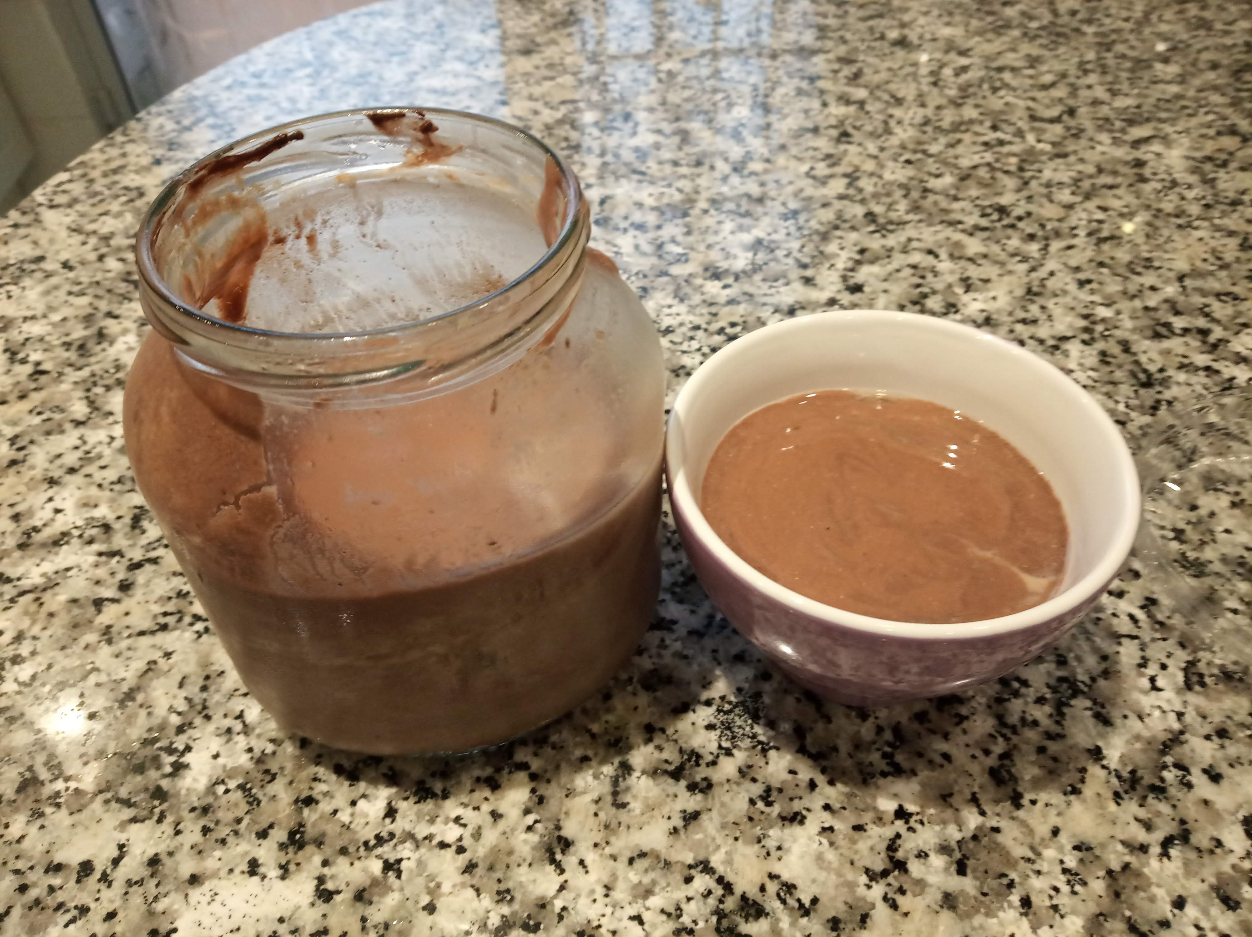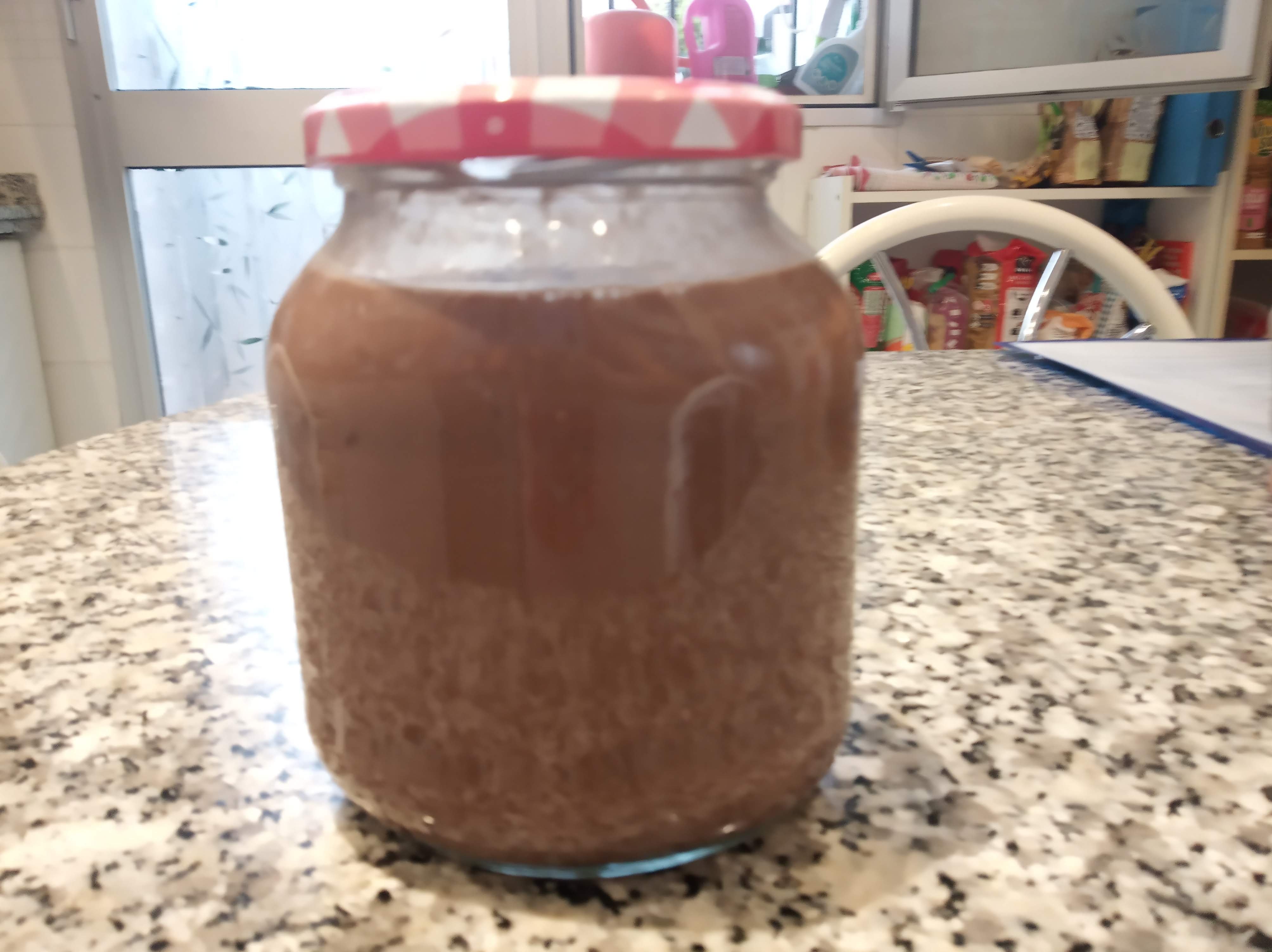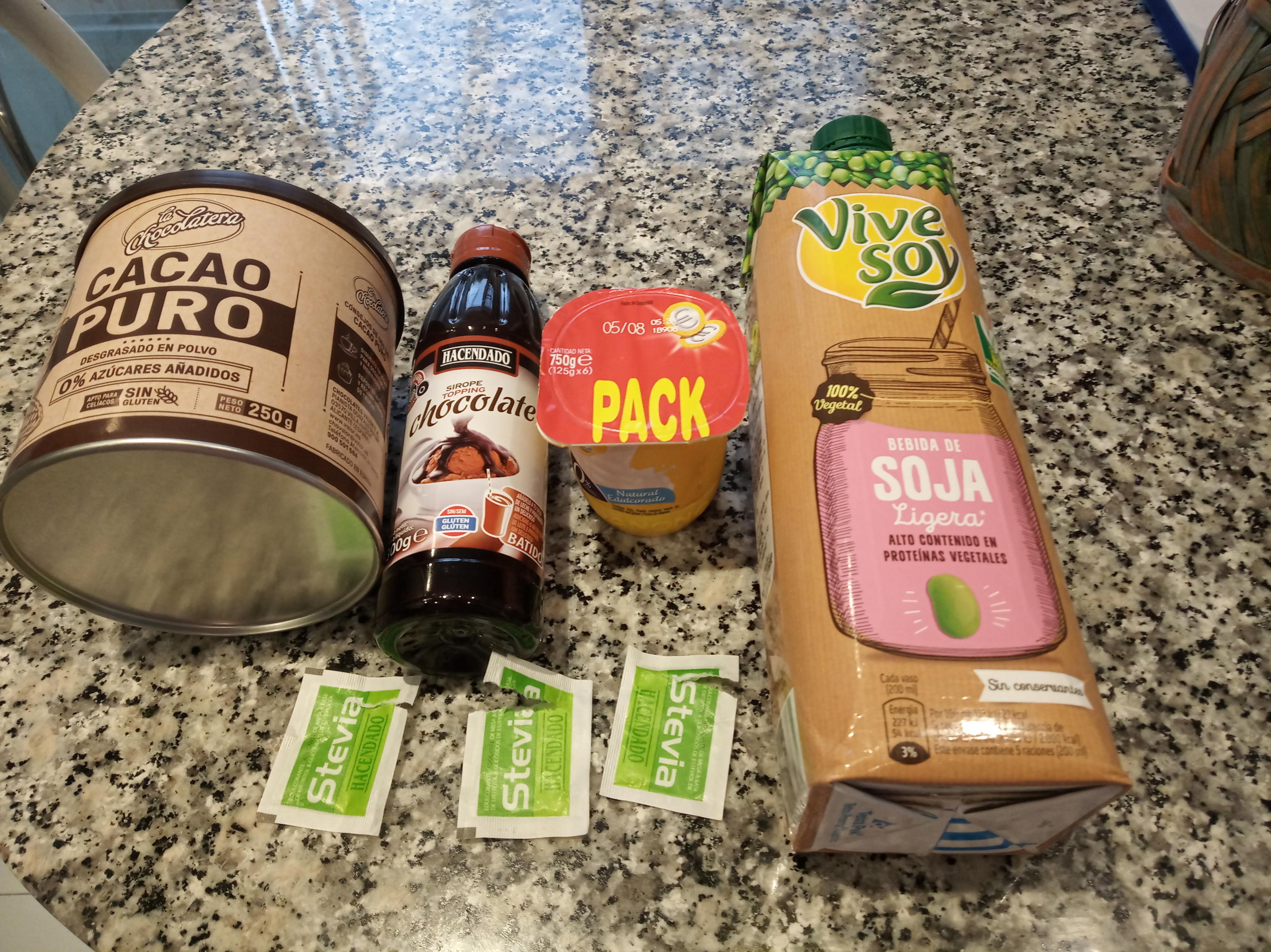 Yo lo hice con soja, stevia y cacao en polvo sin azúcar y un bote de cristal de 750 ml, apto para esa yogurtera de tamaño , al tener el bote original con otro yogur.