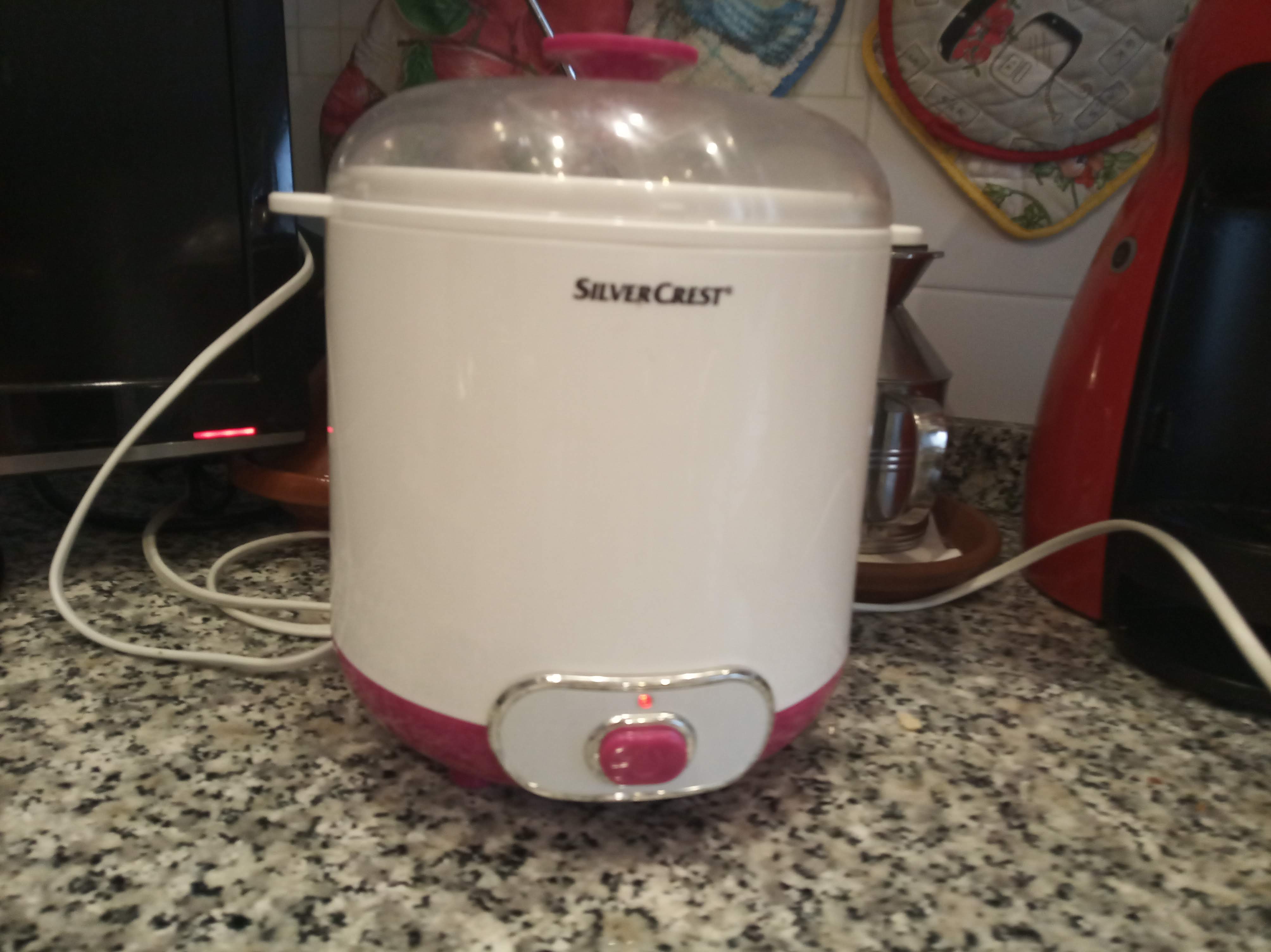 Meter el vaso o vasos tapados en la yogurtera, enchufar y encender, durante 8 horas.
