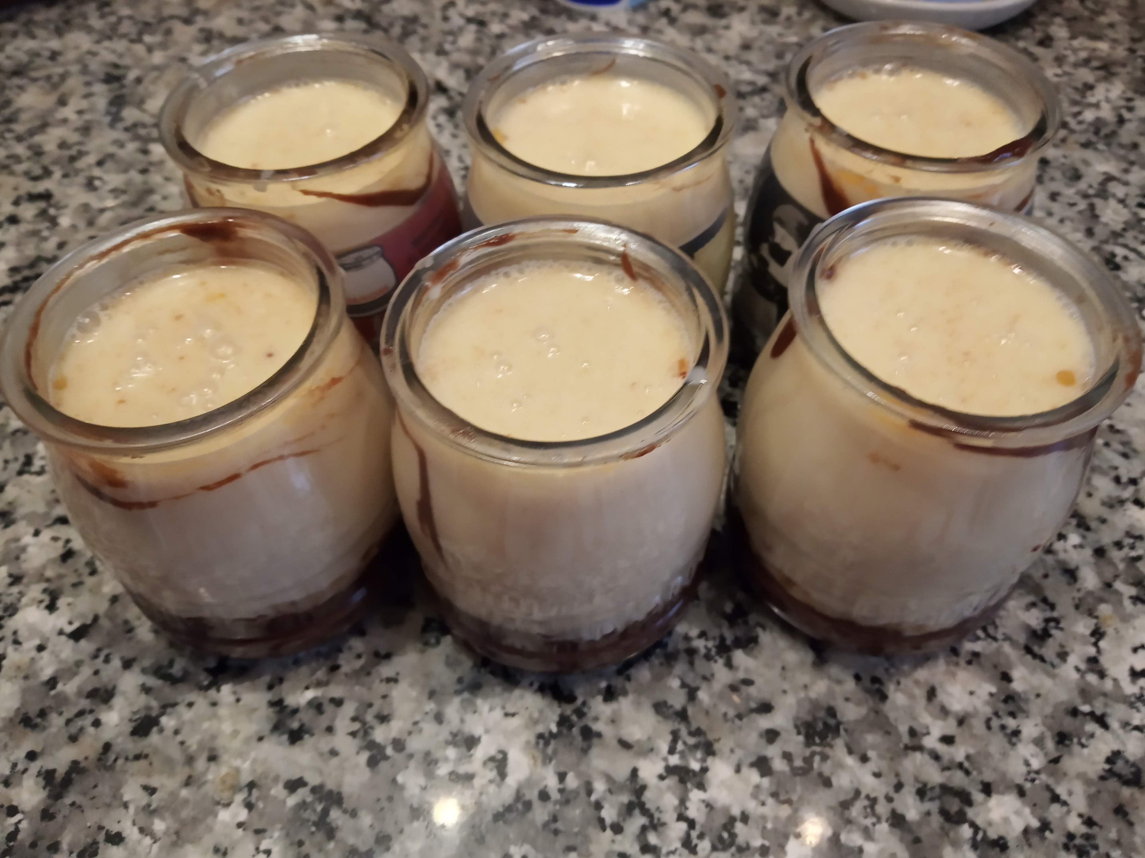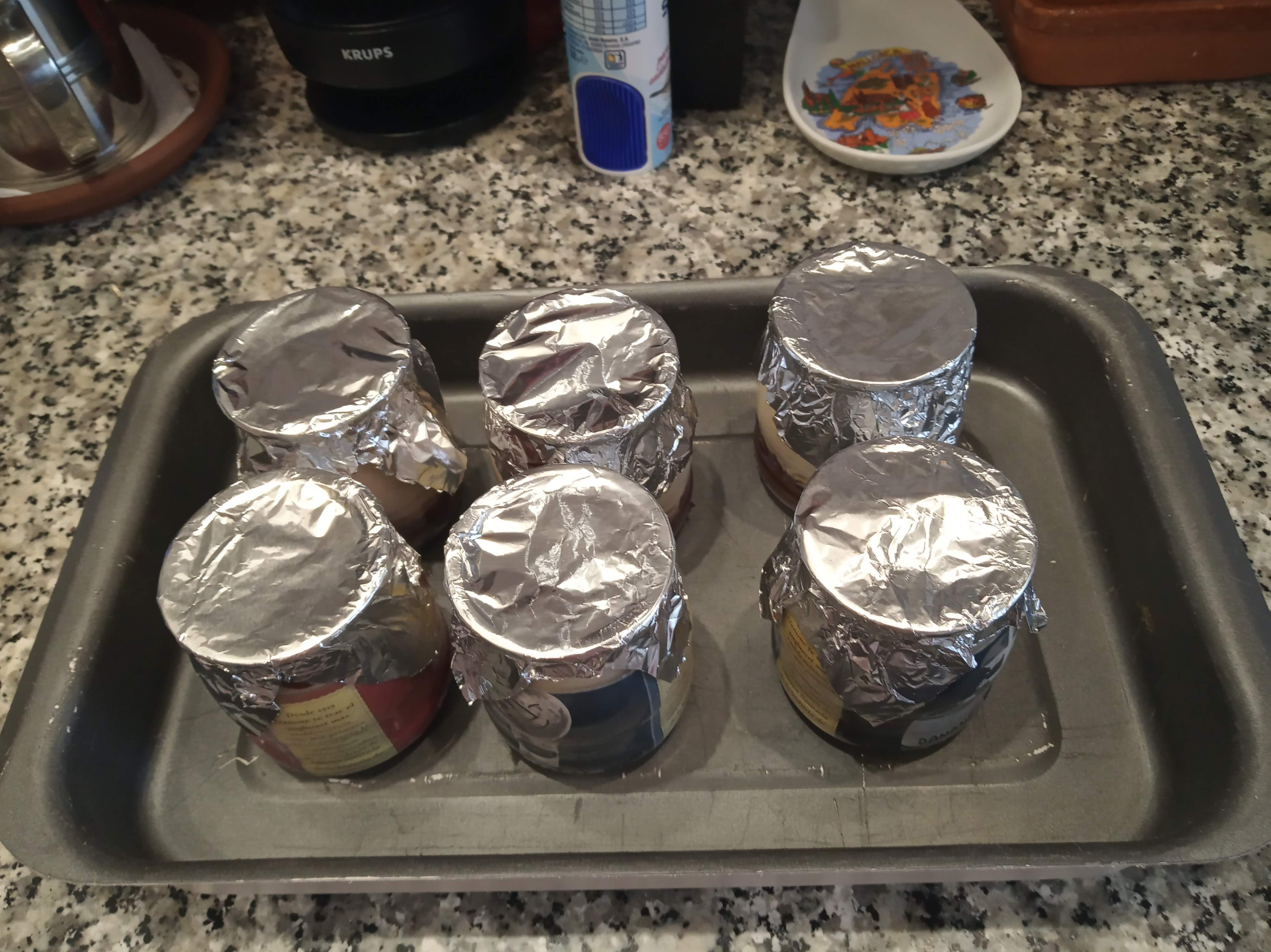 Yo utilicé, 6 vasos de cristal de Danone y papel de aluminio, y lo hice al horno, al tener una yogurtera de un solo vaso, con soja y stevia.