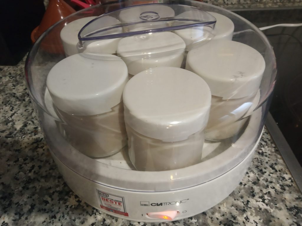 Tapar los botes, y poner en la Yogurtera, tapar con su tapa, y con un paño de cocina, y programar el móvil. o reloj de cocina, 10 h, más tiempo hace que se ponga más agrio.