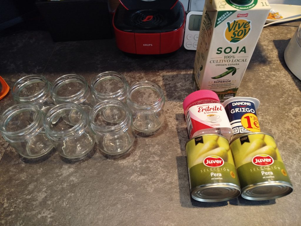 📜📷Receta y fotos del 22/06/2025 con 2 latas chicas de pera en su jugo, bebida de soja y Eritritol, Guardar el suero para hacer batidos de frutas.