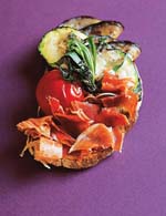 - Reparte las hortalizas y el jamón sobre las rebanadas de pan frito. Sala los canapés y adórnalos con hojas de estragón o de otra hierba fresca.