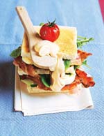 - Unta con esta salsa una rebanada de pan. Pon una loncha de jamón, 1/8 de las rodajas de tomate, una loncha de beicon, 1/8 de las rodajas de huevo, una loncha de panceta, pepino y rúcula y ciérralo.