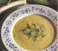 v Sirve la crema de puerros con el salteado