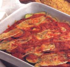 calabacín, salsa de tomate y láminas de queso Camembert, terminando con una