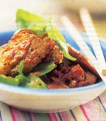 - Cortar el solomillo en lonchas muy finas, salpimentarlas. Retirar las hebras de las vainas de las judías y hervir en agua con sal durante 10 minutos. Cortar la cebollas en tiras finísimas.