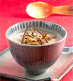 - Sirve la crema en unas tazas de consomé y distribuye por encima de ella los hilos de berenjena recién fritos.