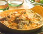 - Untar cuatro cazuelitas individuales con un poco de mantequilla y repartir la mezcla anterior de cebolla, etc... junto con las alcachofas, espolvorear con el queso rallado e introducir en el horno precalentado a temperatura media durante 10 minutos.