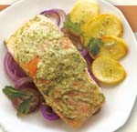 - Colocar sobre la cebolla las supremas de salmón, cubrirlas con la salsa verde y tapar la bandeja con papel de aluminio. Introducirlas en el horno precalentado a 200 º de 10 a 15 minutos.